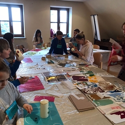 Dieser Arbeitsvorgang hat wirklich einiges von unseren Kindern abverlangt. Sie mussten sich für eine Farbe bei Stoff und Faden entscheiden, dann schneiden, den Stoff mit Schlingstichen zu einer Tasche zusammennähen, sich einen Knopf aussuchen und diesen auch alleine annähen und schlussendlich sehr mutig sein, da sie für den Knopf noch ein Loch in ihre Tasche schneiden mussten. Dann fast am Ende überlegten sich die Kinder auch noch ein Motiv, das sie auf ihre Taschen klebten und drehten ihre Schnüre, damit sie ihre Taschen auch umhängen konnten. Jede Tasche ist einmalig und wunderschön geworden.