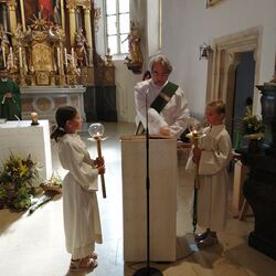 Die Schwestern Lea und Laura vom Erstkommunionkind Lukas Steinberger ließen sich mit drei und fünf Jahren taufen. Das war ein großes Geschenk für die Kinder, denn so konnten sie die Symbole der Taufe hautnah miterleben.