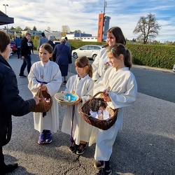 Auch die MINIS halfen mit und boten nach der Feier an den Ausgängen gegen eine freiwillige Spende ihre selbst gebackenen Allerheiligenstriezel an.