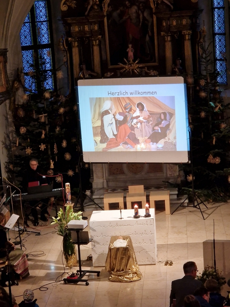 In seiner Predigt sprach Vikar Gerhard von Gott, der als kleines, hilfloses Kind zur Welt gekommen ist, in Armut und Bedürftigkeit. Eine mitgebrachte Windel symbolisiert dies. - Gott ist einer von uns, er kommt uns entgegen. Er ist ein Gott, an den wir uns anlehnen können. Er umarmt uns und stillt unser Verlangen nach Geborgenheit, Liebe und Frieden. …